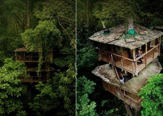 哥斯达黎加热带雨林里的树屋 在哥斯达黎加的热带雨林里,隐藏着一幢幢造型别致的的小木屋。它们栖身在高大的树木枝干上,被浓荫遮蔽。有门有窗还家具齐全,就像是雨林里的精灵们的住所。这一片树屋里有常住居民,也招待游客,就像是一个远离城市喧嚣的桃源乡,它的名字是Finca Bellavista。