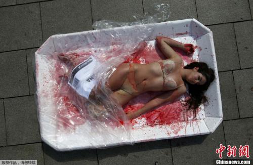 西班牙女子半裸躺入餐盘倡导素食主义