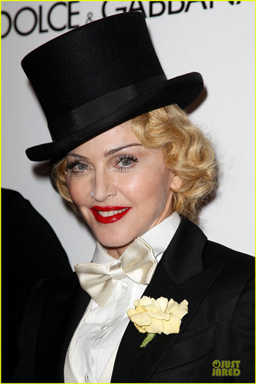 不同于以往热辣性感的装束,麦当娜此次的造型选择了马戏风格的服装。头戴一顶黑色高帽,身着一袭燕尾服,奶油色的绸缎领结和修身马甲,再配上一双复古黑白拼色皮鞋,四个字:帅气干练!同时,盘起的金色卷发,会放电的眼睛和烈焰红唇,如此一来使得这位天后更加散发迷人魅力。
