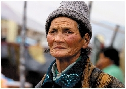 村南头一位老人望着远方,她的左眼已经失明,安上了假眼。