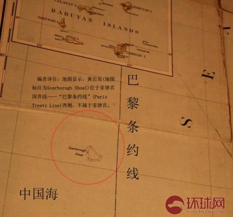 黄岩岛是中国的毋庸置疑 地图以国际通用的国界线符号标明了菲律宾的国界,吕宋岛附近的国界线还写明了“巴黎条约线”(Paris Treaty Line)。地图显示,黄岩岛(地图标注为Scarborugh Shoal)位于菲律宾国界线西侧,在该区域还有中国海(China Sea)的英文标注。 2013年年初,一直叫嚣对中国黄岩岛拥有主权的菲律宾就南海争端单方面将中国告上国际海洋法庭。事实上,就黄岩岛问题,菲律宾主张的依据之一就是一张1820年的菲律宾地图。不过,古地图收藏家、南海问题研究学者真诚先生5月25日首次向环球网记者展示了一张1908年美国纽约出版的菲律宾地图,上面用国界线以及“中国海”的文字等方式标明,被称作“Scarborugh Shoal”的黄岩岛是属于中国的。