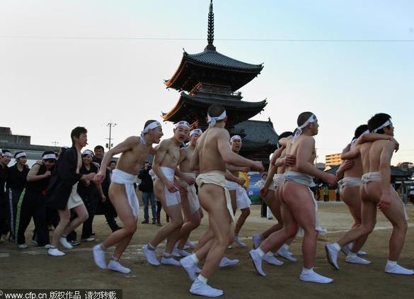 日本裸体节举行,男子们缠着裹腰布,女子们围着浴巾进入到冰冷的水中,进行庆祝。裸体节是日本相对古怪的一个节日之一,大约9000男子参加到这一活动之中,试图争夺“宝木”。据悉夺得宝木的人可以将其插入装有稻米的盒子中,象征着一年的幸福。