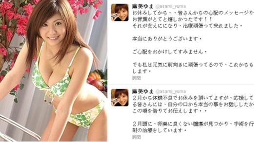 麻美由真在Twitter公布患癌消息 麻美患癌的消息已经在网上疯传,好多男网友纷纷发出慰问,麻美之前已经消失过一阵子,直至4月初她再现身,突然激瘦,于是传言四起。